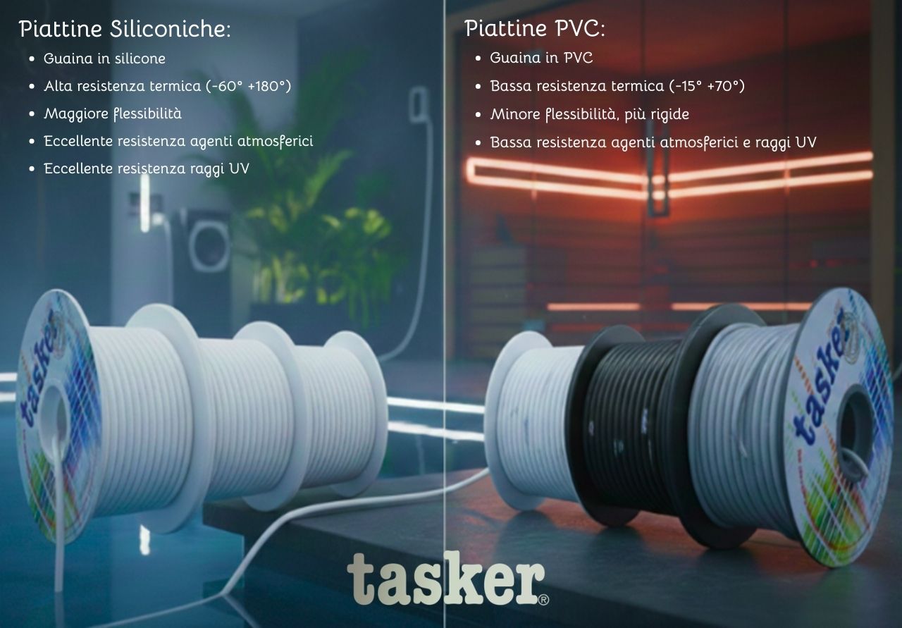 - – Piattine Siliconiche: offrono prestazioni eccezionali in un range estremo, da -60°C fino a +180°C. Questa caratteristica le rende indispensabili dove il calore è costante o dove il freddo è intenso, garantendo che il cavo rimanga flessibile e sicuro nel tempo.